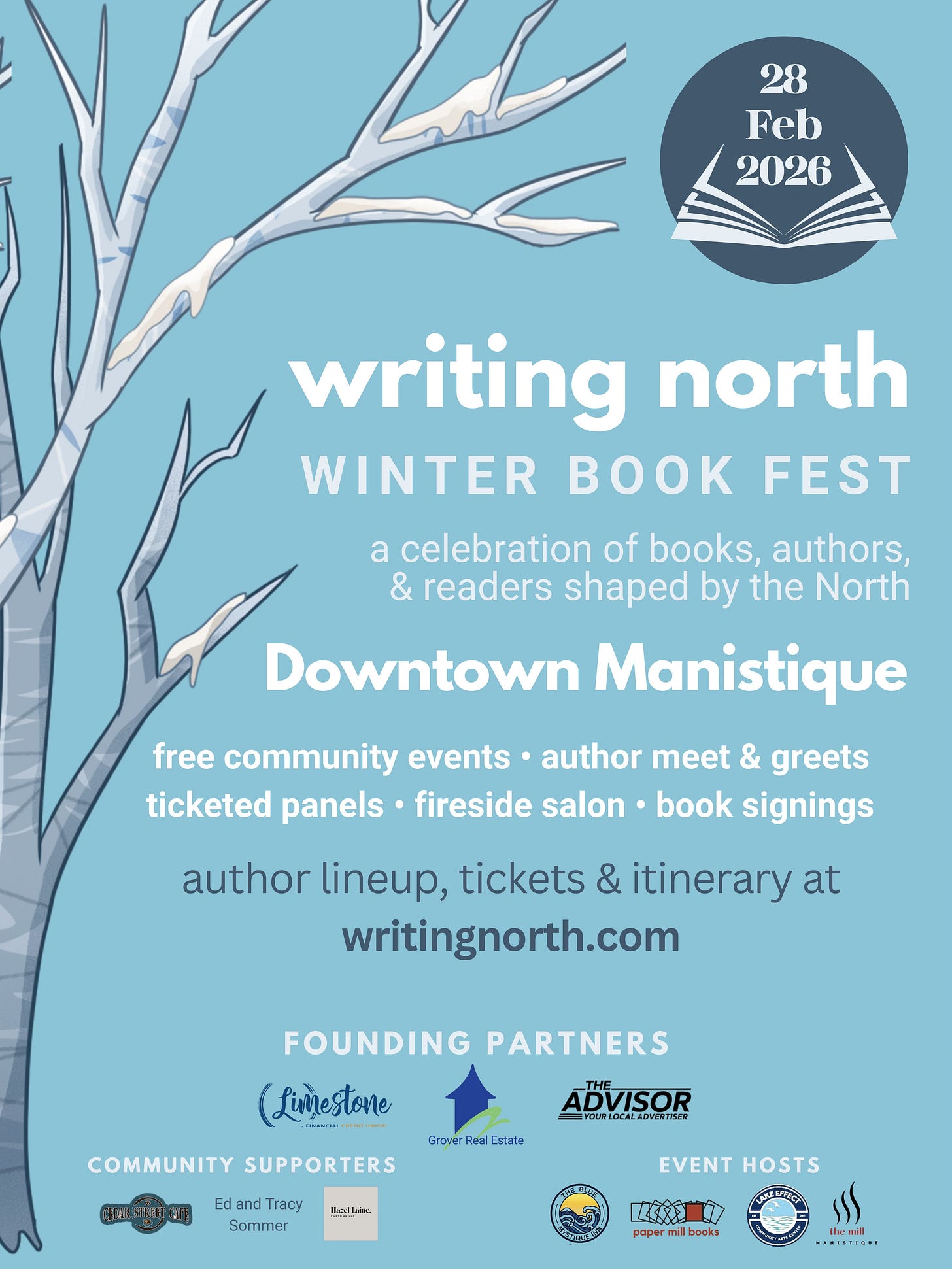 Writing North Book Fest: I’ve been thrilled to help Meagan Francis (I’m 100% the grunt) with the planning of the Writing North Winter Book Fest, the first literary festival of its kind in Manistique, Mich., just off of Highway 2 in the heart of the U.P. It’s going to take place on Saturday, Feb. 28 and Sunday, Mar. 1 and it’s jam-packed with free and ticketed events, including readings, signings, panels, workshops, kids' time, and a really cool evening literary salon. I’m seriously so excited to meet other Great Lakes authors like Karen Dionne, Bryan Gruley, Ellen Lord, T. Marie Bertineau, Anne-Marie Oomen, Helen Raica-Klotz, Mikel Classen, Steve Amick, Carol Dunbar, Iliana (Lane) Regan, and Dave Dempsey. An event like this in the UP is much needed, particularly in the winter when we’re feeling so beat down by the snow. Meagan and event host The Mill Manistique are giving Yoopers something to be excited about in what can be a very difficult time of year. I’m looking forward to seeing this festival expand in the coming years.
